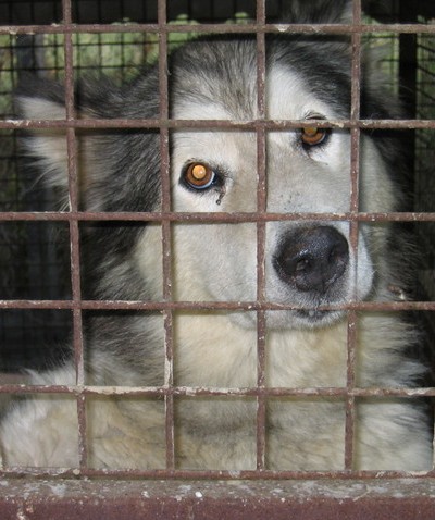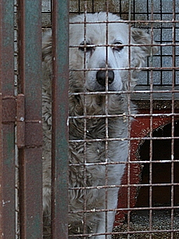 einem sehr engen Käfig in der Tötungsstation gehalten